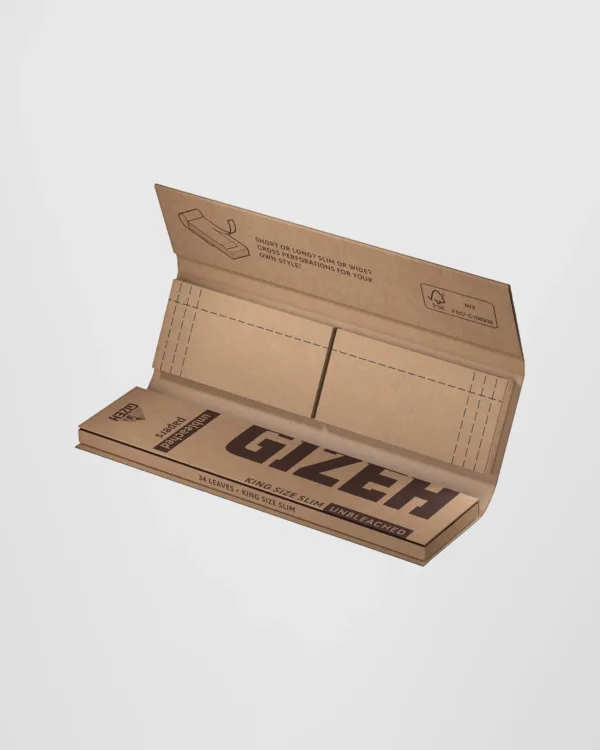 El Papel GIZEH Unbleached Natural 110 mm + Tips combina papel natural sin blanquear en formato King Size con filtros incluidos, ofreciendo una solución práctica y completa para el liado. Elaborado con fibras naturales, su característico tono marrón y combustión lenta garantizan un quemado uniforme y una experiencia más auténtica.